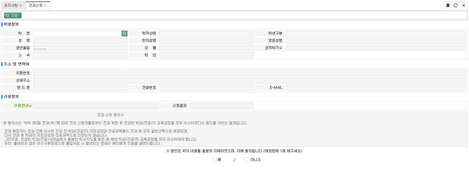가. [학사정보시스템→학적→전과관리→전과신청] 메뉴에서 본인이 직접 신청 전공을 선택하여 제출